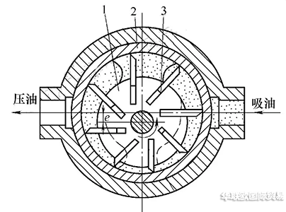 單作用BERARMA葉片泵排量計算:單作用葉片泵定子2內環為圓,R為定子內表面半徑;轉子1與定子存在偏心e,銑有z 個葉片槽;葉片3在轉子葉片槽內自由滑動,葉片寬度為B;左、右配流盤銑有吸、壓油窗口。