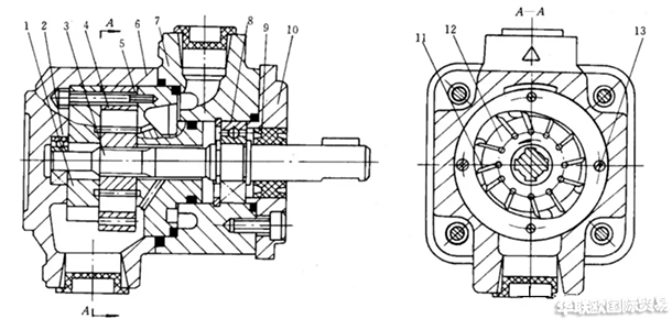 1-左配油盤;2-軸承;3-泵軸;4-定子;5-右配油盤;6-泵體;7-前泵體;8-軸承;9-油封;10-蓋板;11-葉片;12-轉子;13-緊固螺釘