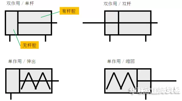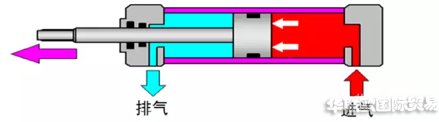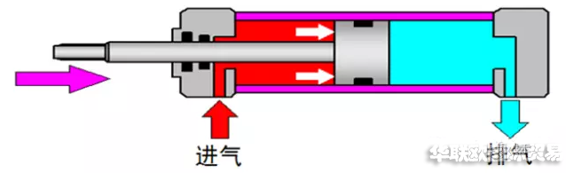 當有桿腔進氣,無桿腔排氣時,使活塞桿縮回。若有桿腔和無桿腔交替進氣和排氣,活塞實現(xiàn)往復直線運動。