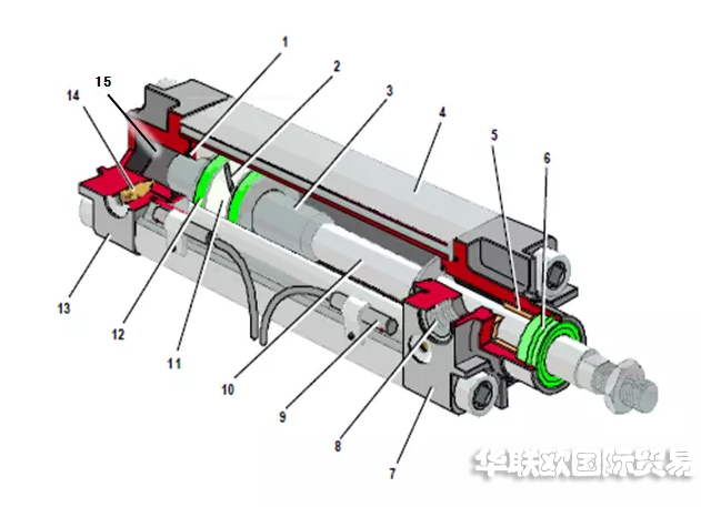 2-活塞3-緩沖柱塞 4-缸筒 5-導向套 6-防塵圈 7-前端蓋 8-氣口 9-傳感器 10-活塞桿 11-耐磨環(huán) 12-密封圈 13-后端蓋 14-緩沖節(jié)流閥 15-緩沖套