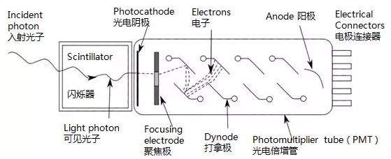 光電倍增管分為頂窗型(Head-on)和側窗型(Side-on)兩種結構,內部包含光電陰極、聚焦極、多個倍增極(二次發射極)和陽極,每個倍增電極上的電壓都高過它前面一個電極,使得電子能夠逐級加速。入射光子撞擊光電陰極產生光電效應,激發出的光電子被聚焦到倍增系統,經過一連串的二次發射使得電子倍增,最后到達陽極作為信號輸出。