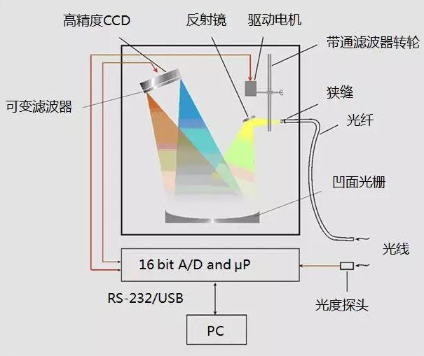 機械掃描式光譜儀通常由單色儀、光電倍增管探測器、數據處理系統等幾部分組成。其特點是測量精度高,但儀器龐大,結構復雜,掃描時間較長。主要用于各種高精度光色測量領域,不適合測量對時間敏感的光源或其他快速測量應用。