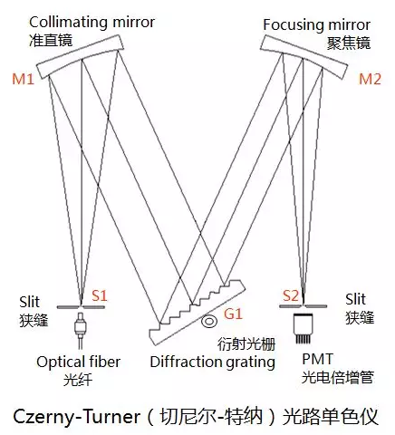 單色儀的光路如下圖所示,光源或照明系統發出的復合光線經光纖引導至入射狹縫并投射到準直反射鏡上,經準直反射鏡將發散光變換為平行光束再照射到衍射光柵,利用每個波長離開光柵的角度不同,由聚焦反射鏡再把某一波長的單色光反射到出射狹縫,光電倍增管(PMT)就可以測定這個波長的數值和強度。光柵在步進電機的帶動下勻速轉動,出射狹縫就可以得到不同波長的單色光,通過同步讀取光柵角度和光電倍增管的輸出信號,就可以得到復合光的全部光譜信息。