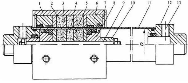 1-套筒,2-外磁環,3-外磁導板,4-內磁環,5-內磁導板,6-壓蓋,7-卡環,8-活塞,9-活塞軸,10-緩沖柱塞,11-氣缸筒,12-端蓋,13-進、排氣口