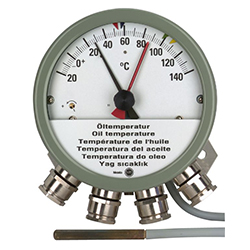 ②帶有可調微動開關的指針式溫度計可靠地測量配電變壓器、電力變壓器、電抗器或類似應用中的油溫與繞組溫度(熱像)。
